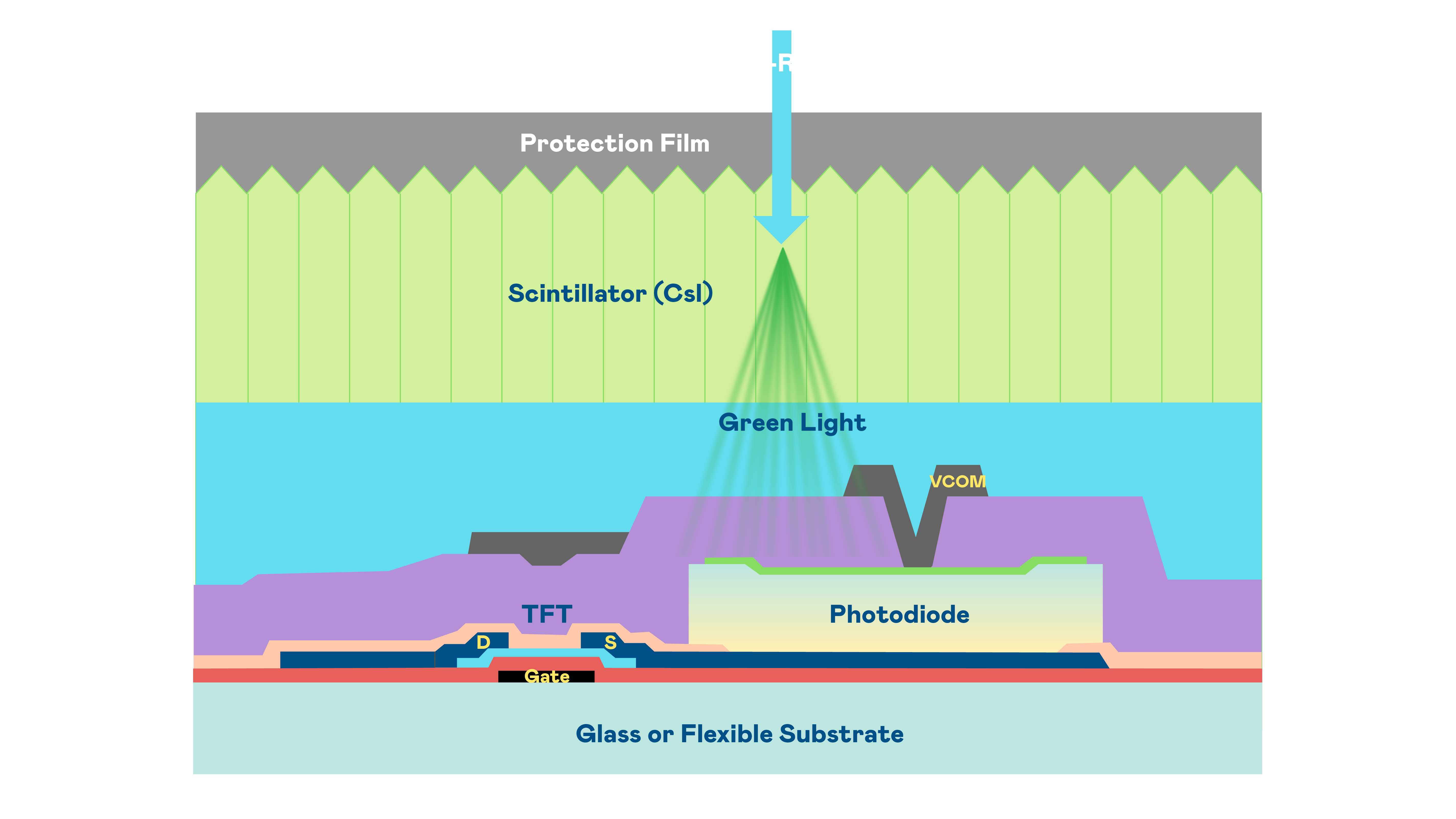 云顶集团3118的X光影像感測陣列使用薄膜電晶體 (TFT) 作為每個像素的讀取開關,搭配光電二極體(Photodiode)的光電轉換元件,用以感測X光影像訊號。